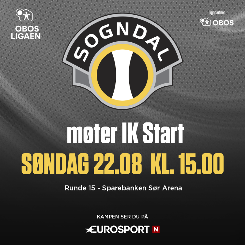 Start - Sogndal. Sør Arena, Avspark søndag klokka 15:00