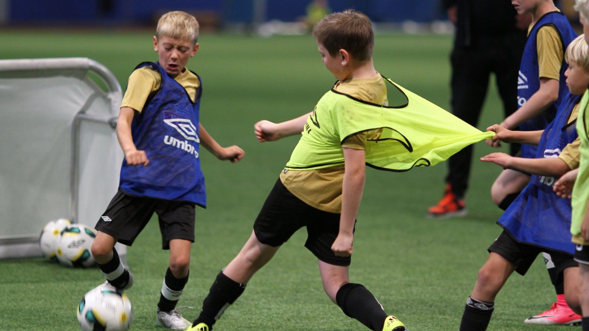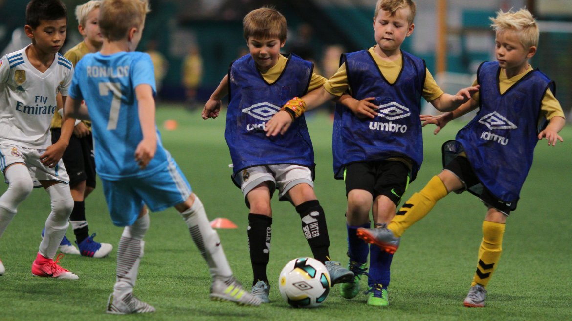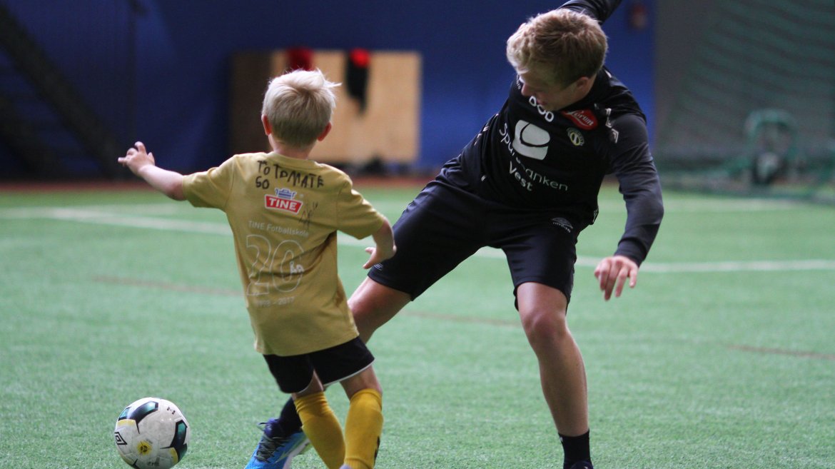 Sju grupper med born spelar fotball så det ljomar i Sognahallen. Instruktørane er med i spelet, instruerer og held orden på alle saman. - Skal eg eller du ta innkastet? spør instruktør Eivind Helgesen. - Eg! lyder det kontant frå ein gut i blå vest.