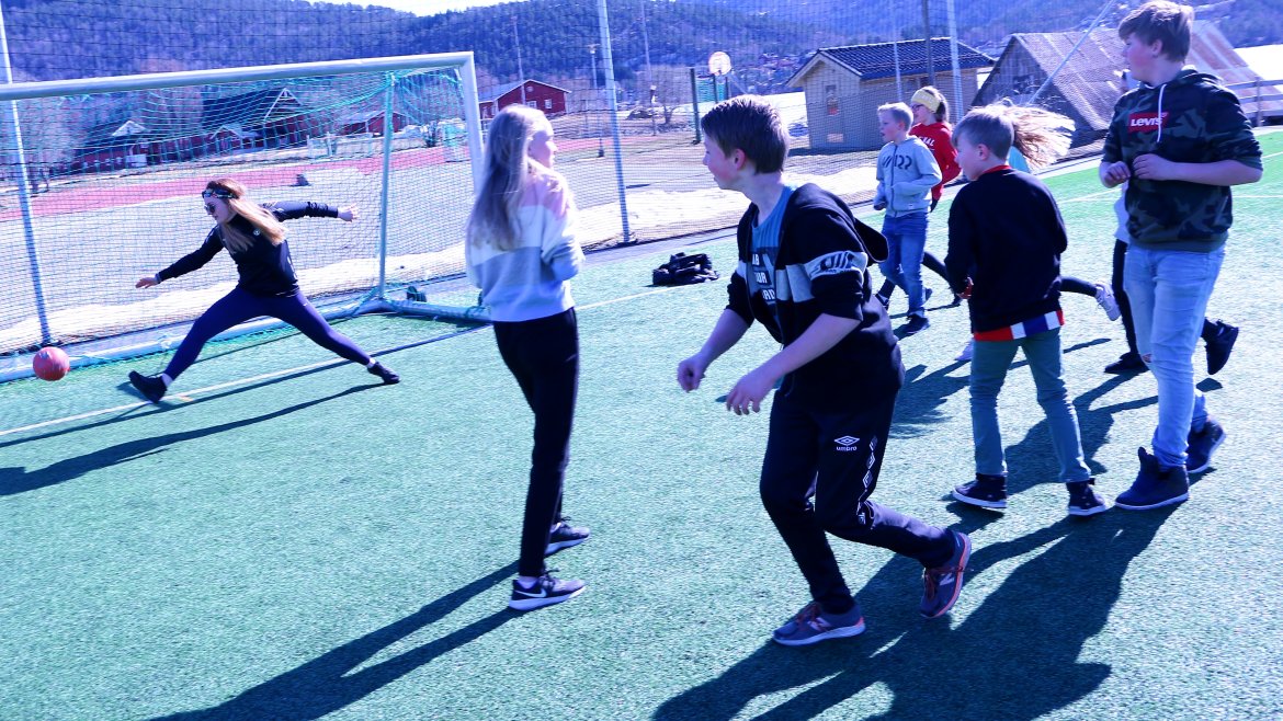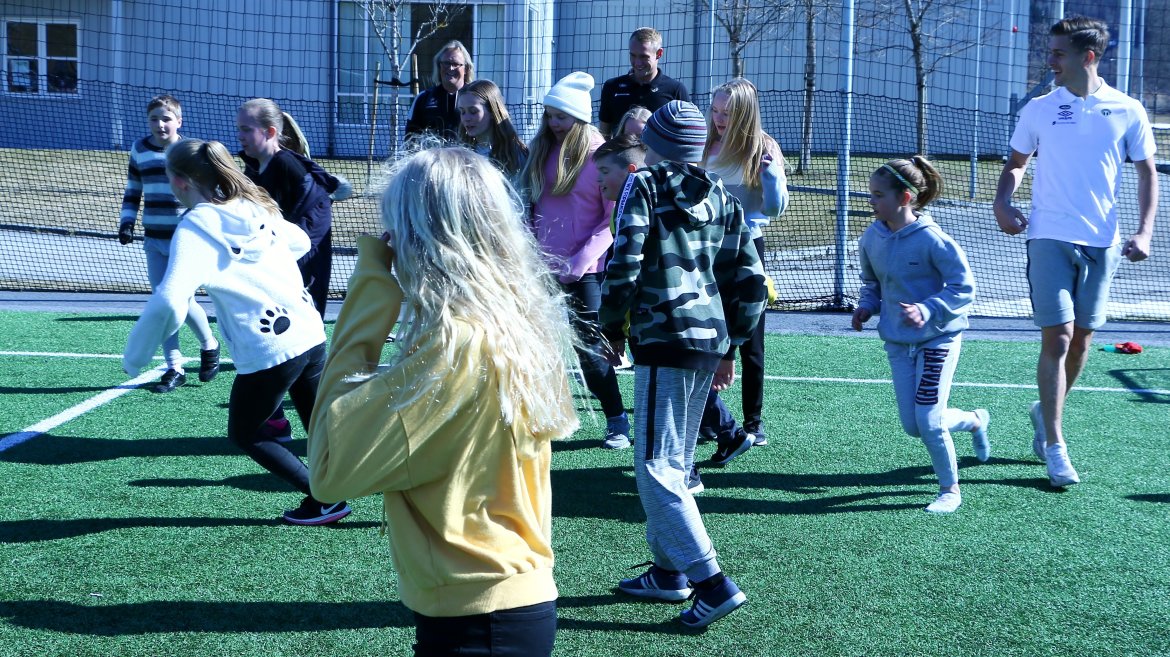 Elevane fekk ta selfiar med spelarane og fekk autografane deira, før me gjekk og ut avslutta med fotballkamp på det flotte kunstgrasdekket dei har på Hafslo.