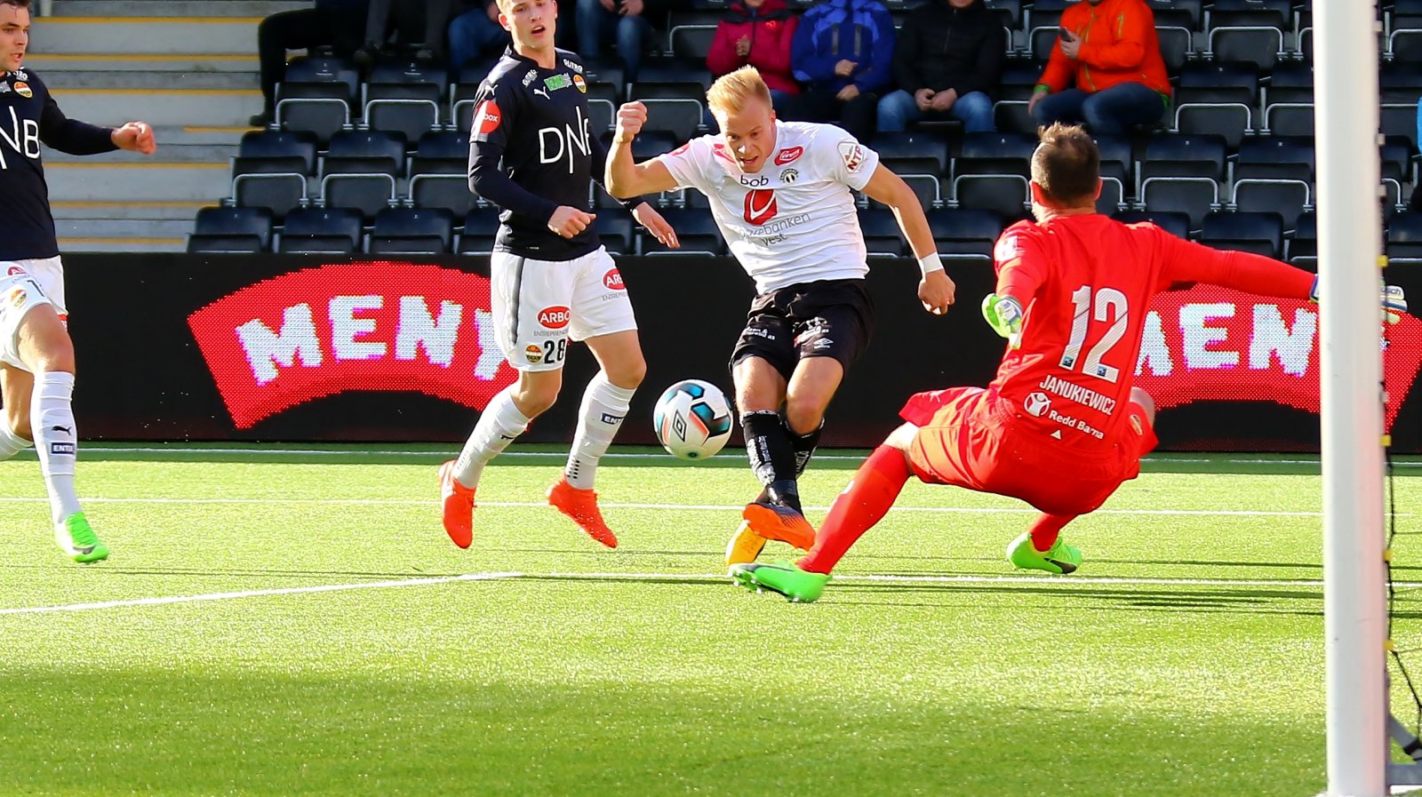 Det starta litt fram og tilbake. Strømsgodset hadde ein ball i tverrleggjaren bak Mathias Dyngeland i starten, og i det 14. minuttet tok bortelaget leiinga ved Bassel Jradi.