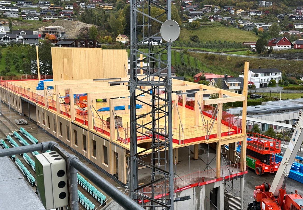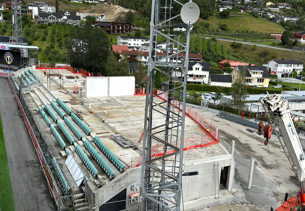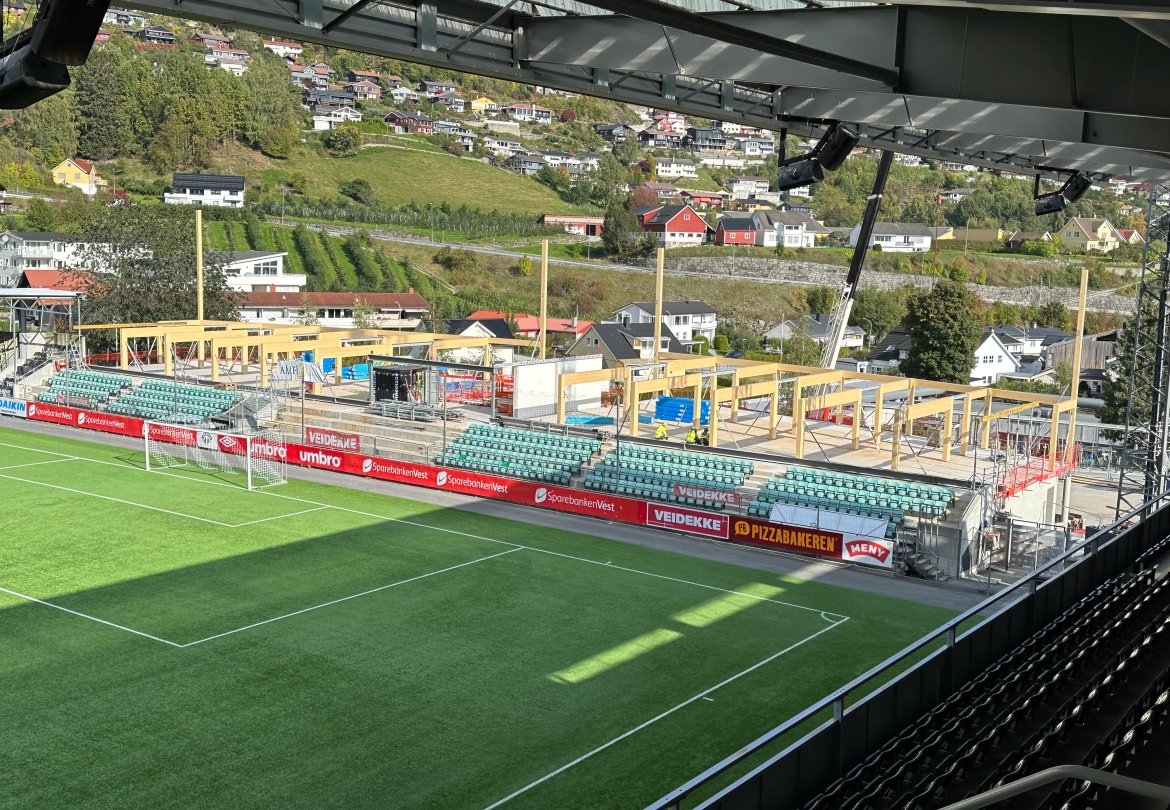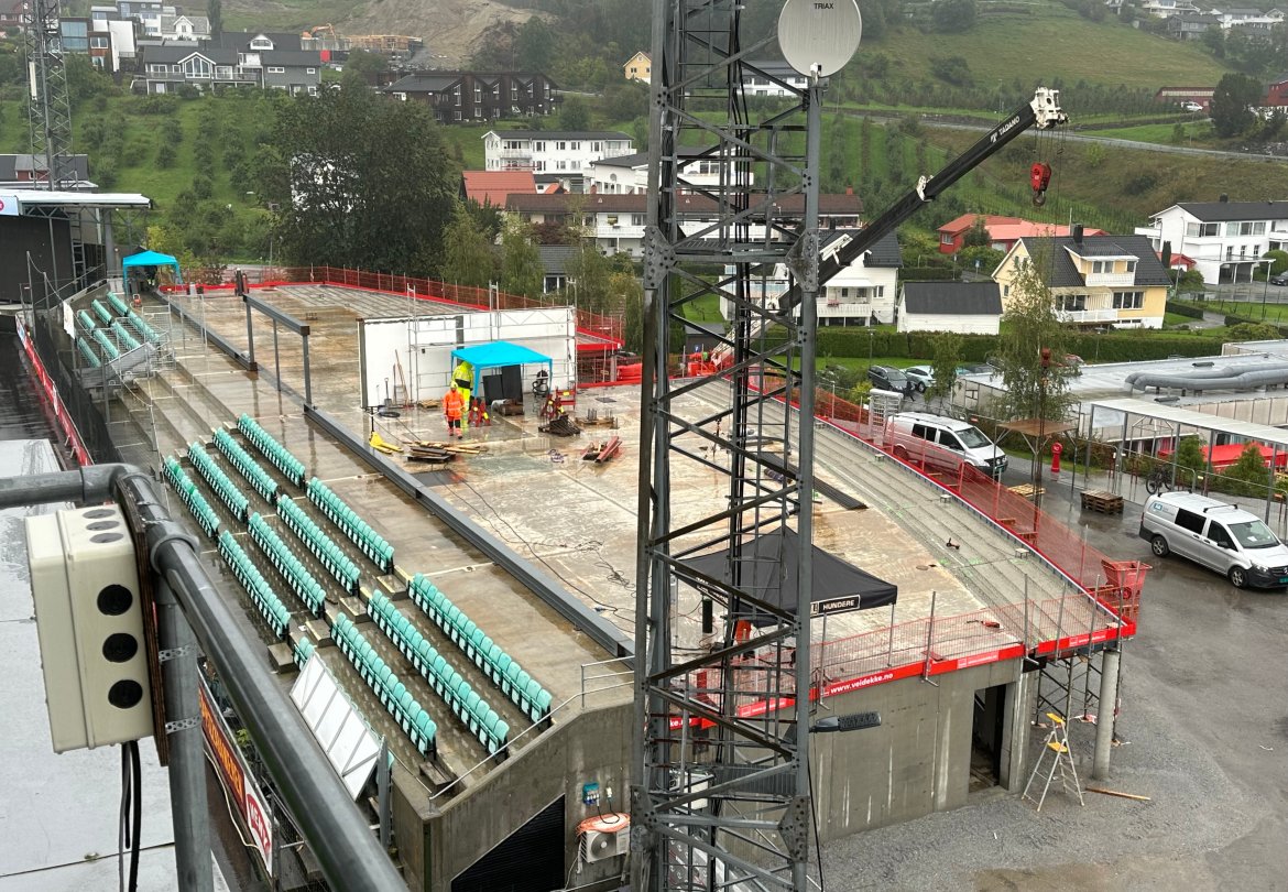 Det har kome nokre spørsmål om selskapet byggjer ny tribune i dette bygget. Det gjer dei ikkje. Det nye bygget er eit reint næringsbygg med eksisterande tribune i front mot bana. Det vil seie at sjølve tribuna blir den same som før, men at bygget bak vil huse nye fasilitetar.